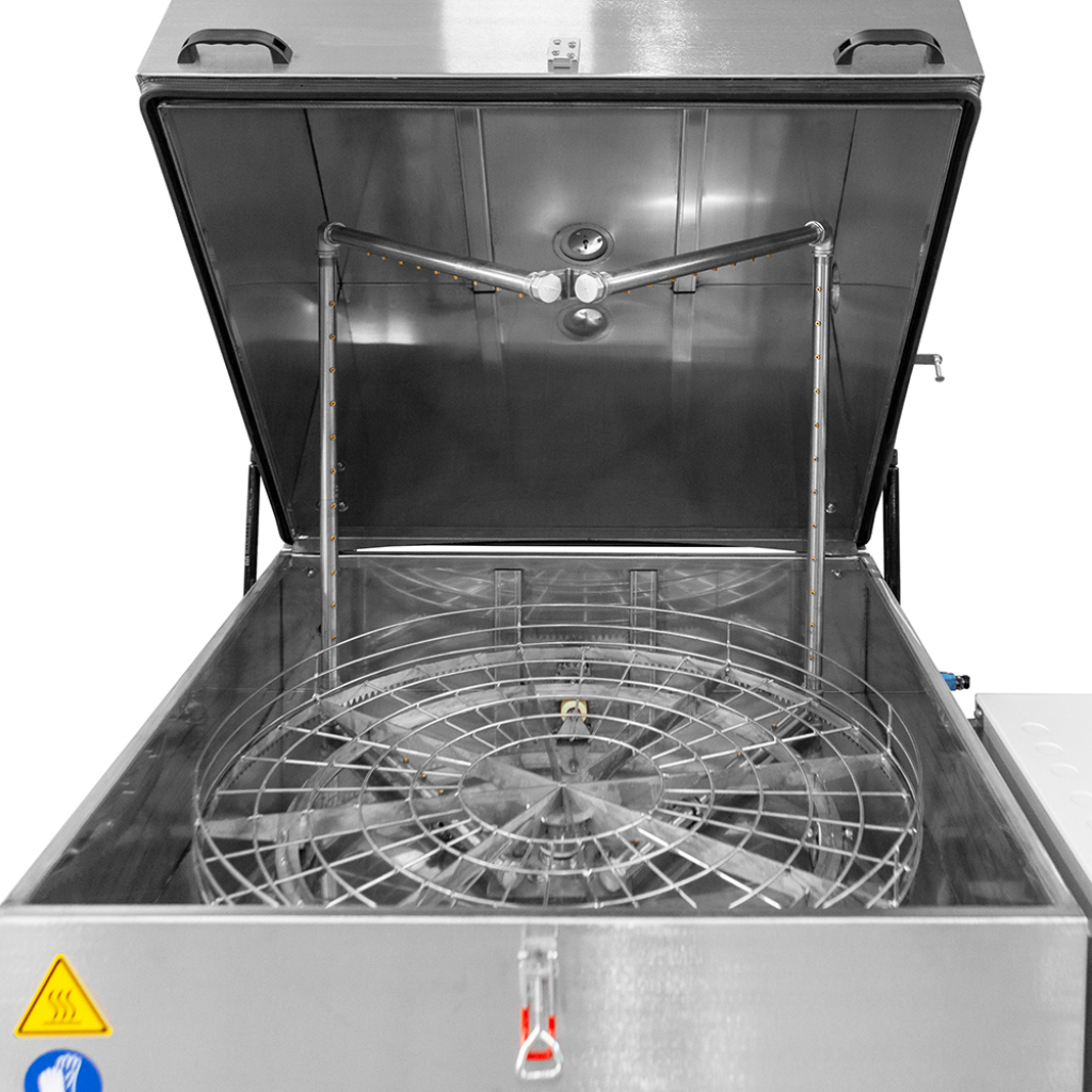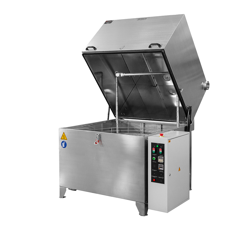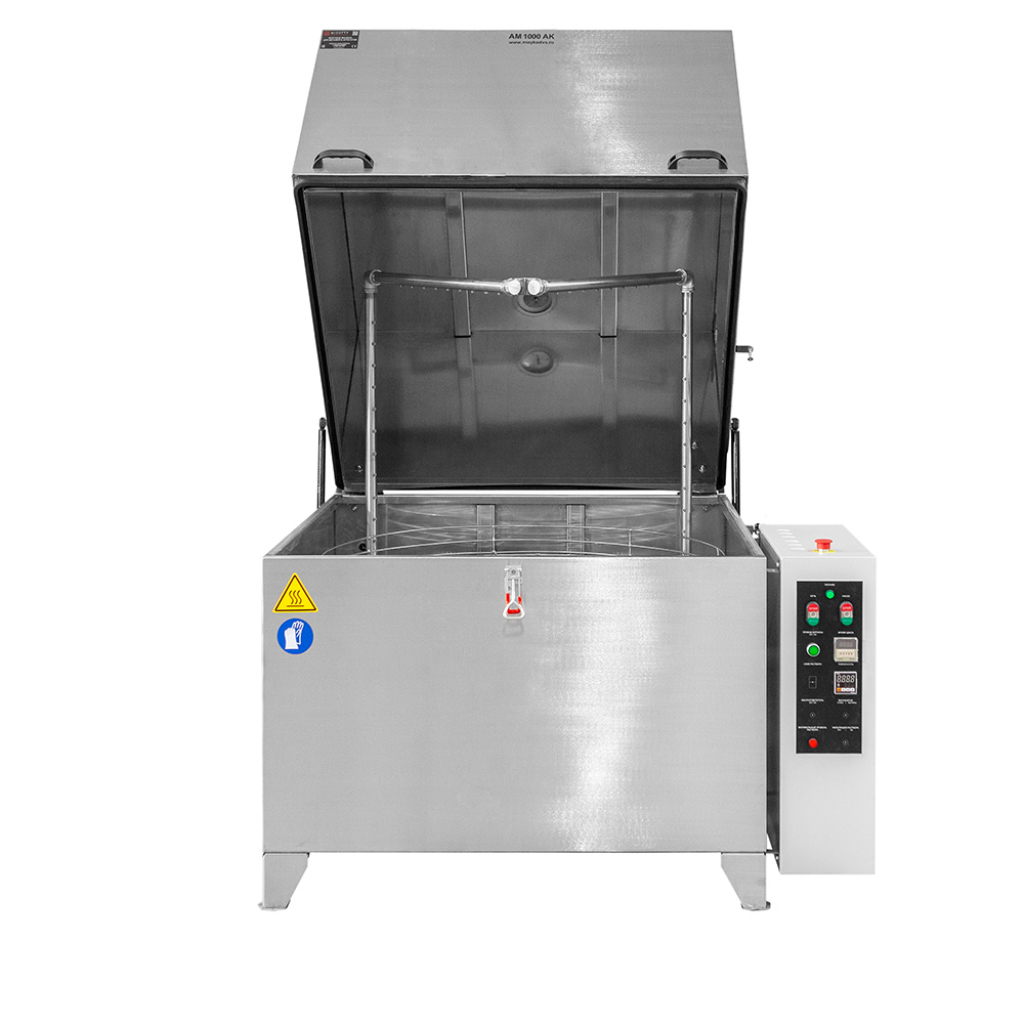 Температура и продолжительность цикла обработки задается на панели управления. Вращение корзины обеспечивает необходимое позиционирование деталей перед коллекторами. Парная П-образная форма рамп позволяет промывать изделия сверху, снизу и сбоку в течение заданного времени. Автоматические промывочные установки серии АМ предназначены для использования со слабощелочными растворами. Для наполнения бака используется обычная водопроводная вода.