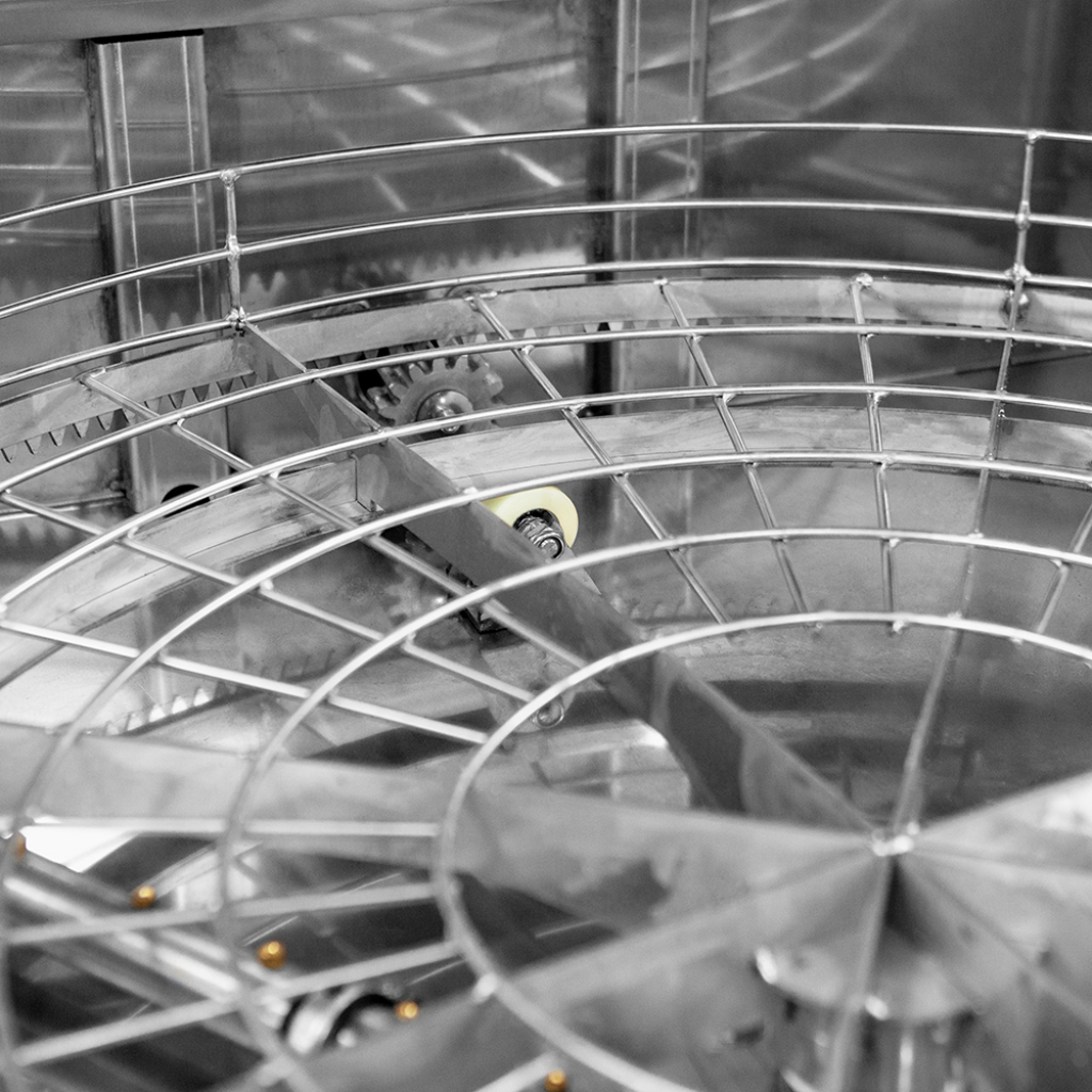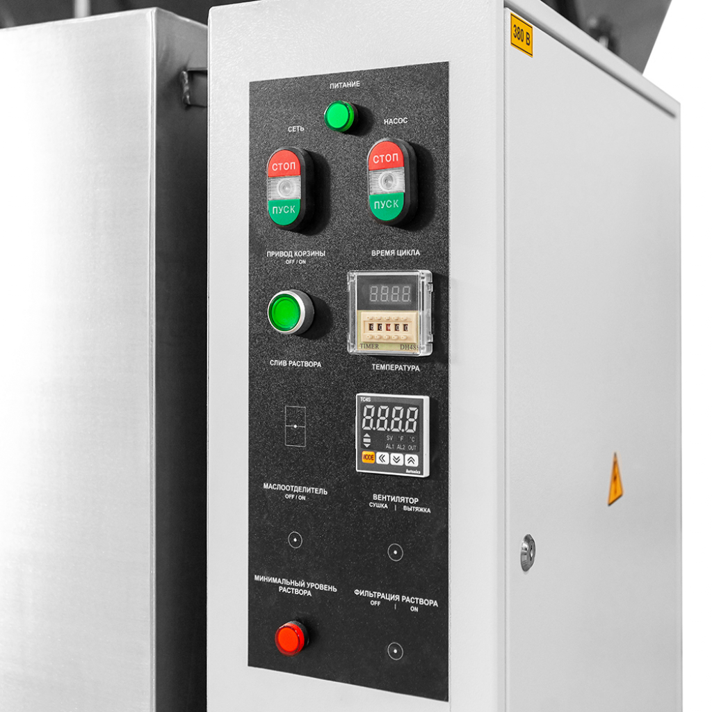 Линейка комплектуется электромеханическим приводом корзины с частотой вращения 5-10 об/мин., обеспечивающим высокое качество очистки, за счет равномерной подачи моющего раствора по всей поверхности деталей.