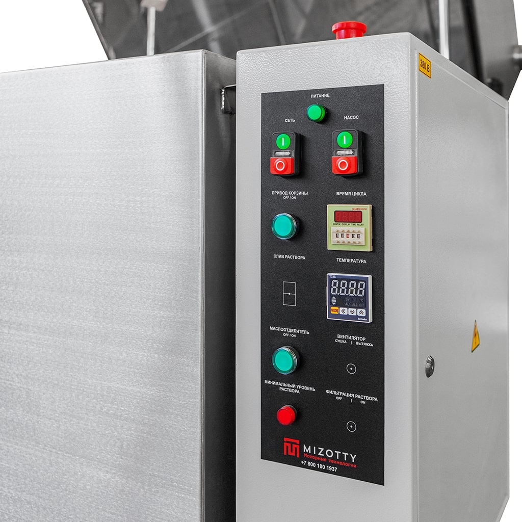 Линейка комплектуется электромеханическим приводом корзины с частотой вращения 5-10 об/мин., обеспечивающим высокое качество очистки, за счет равномерной подачи моющего раствора по всей поверхности деталей.