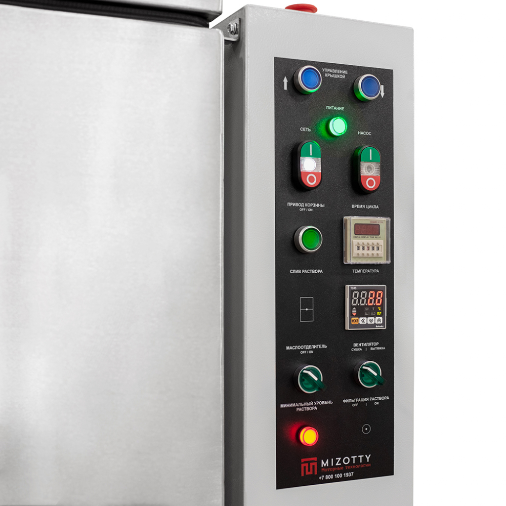 Линейка комплектуется электромеханическим приводом корзины с частотой вращения 5-10 об/мин., обеспечивающим высокое качество очистки, за счет равномерной подачи моющего раствора по всей поверхности деталей.