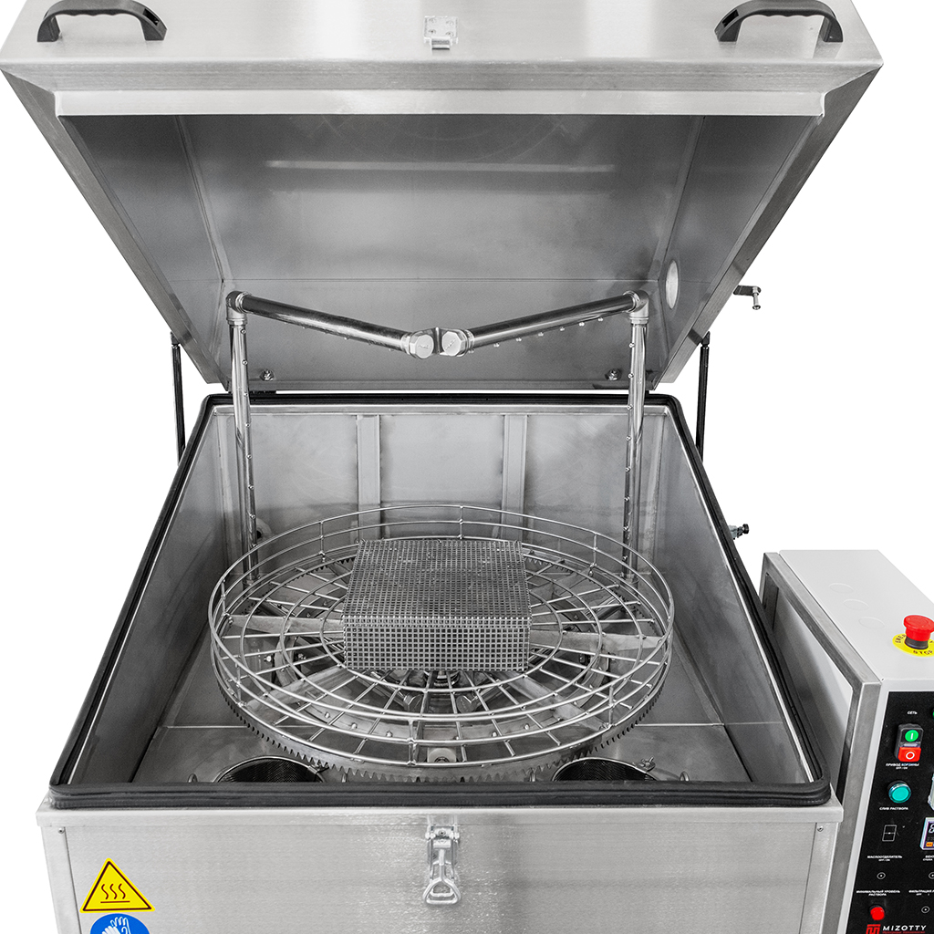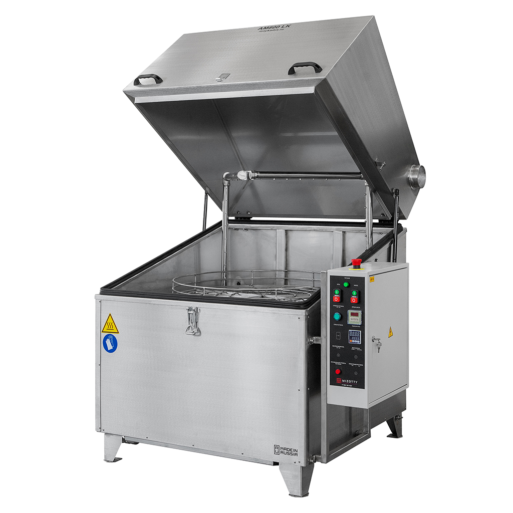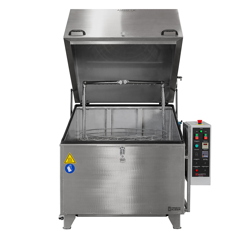 Температура и продолжительность цикла обработки задается на панели управления. Вращение корзины обеспечивает необходимое позиционирование деталей перед коллекторами. Парная П-образная форма рамп позволяет промывать изделия сверху, снизу и сбоку в течение заданного времени. Автоматические промывочные установки серии АМ предназначены для использования со слабощелочными растворами. Для наполнения бака используется обычная водопроводная вода.