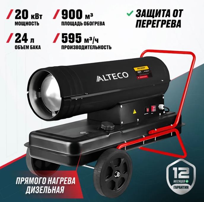 Дизельная тепловая пушка прямого нагрева ALTECO A 2000 DH предназначена для быстрого обогрева открытых и хорошо вентилируемых помещений - строительных площадок, ангаров, гаражей и складов. Тепловая пушка обеспечивает мгновенный нагрев воздуха и равномерное распределение тепла. Большой топливный бак позволяет работать без дозаправки до 12 часов, а встроенные системы контроля пламени и защиты от перегрева гарантируют безопасную эксплуатацию. A 2000 DH отличается высокой мощностью и эффективным расходом топлива, относится к категории профессионального оборудования.