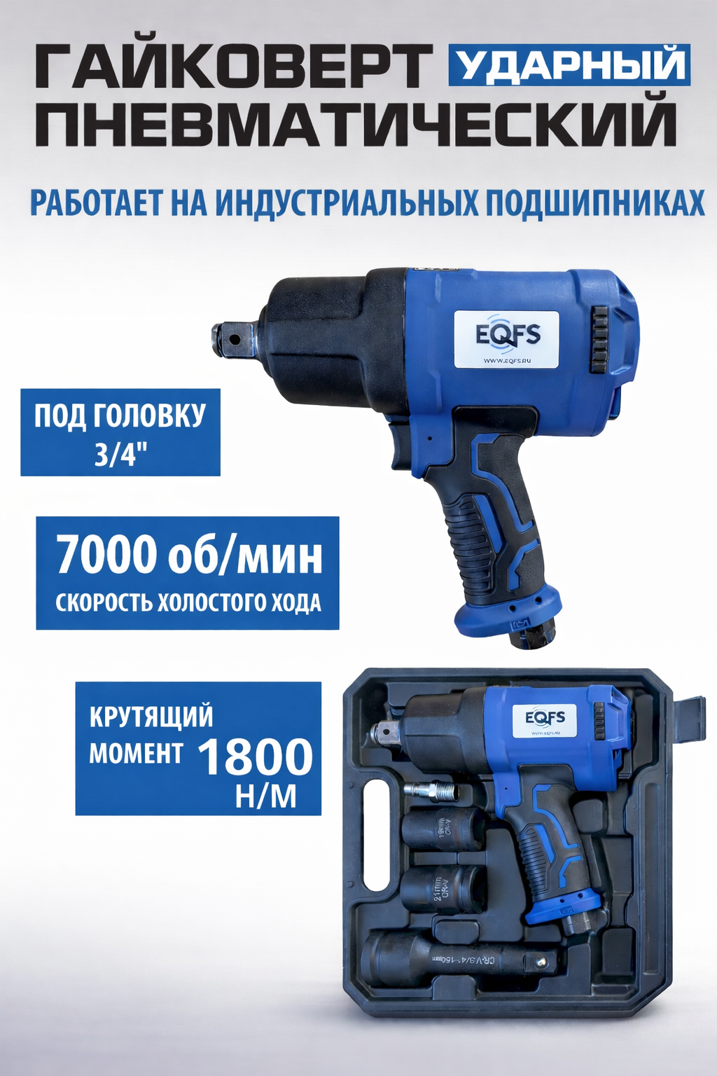НАБОР: Пневмогайковерт 3/4" Крутящий момент 1800 Нм. + набор головок CR-VA - 19, 21 мм + удлинитель. Позволяет открутить сильно прикипевшую гайку или болт. Устойчив к перегрузкам - работает на индустриальных подшипниках. Ударопрочный - изготовлен из морозо/ударо- устойчивого пластика (облегченный композитный корпус) - ВЕС-2,35 кг. Обрезиненная рукоятка. Реверс, регулировка крутящего момента – 3 режима. Механизм – Twin Hammer (двойной молоток). Высокая скорость - 7 000 об/мин.