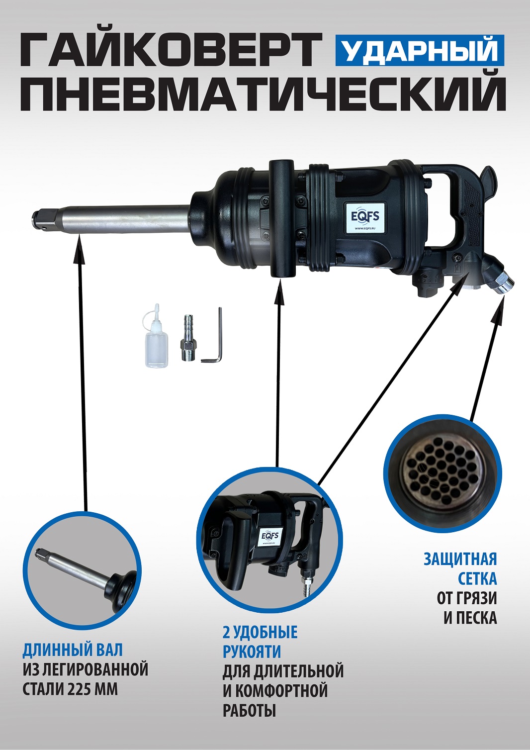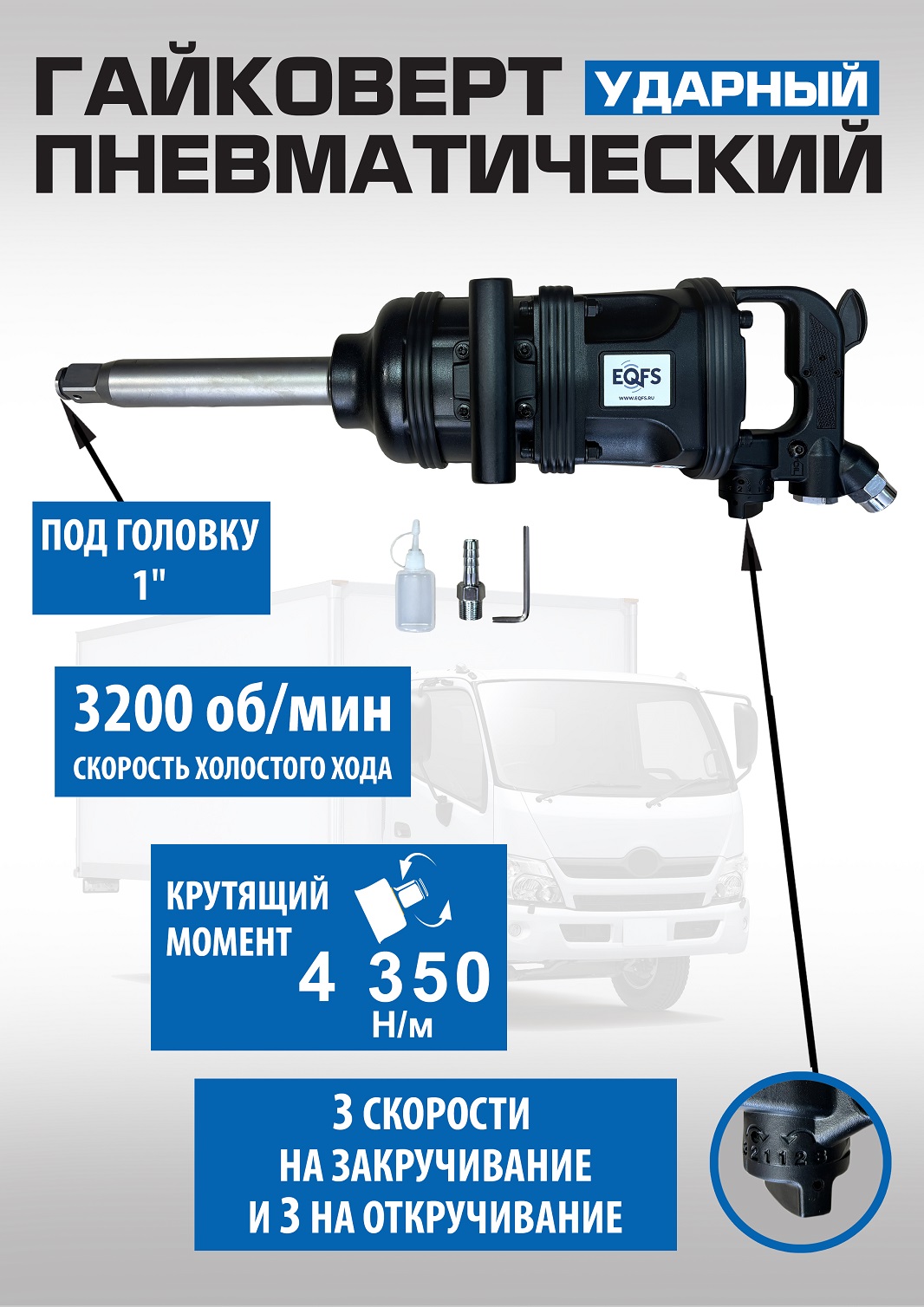 Грузовой гайковерт 1". 4350 Нм. Ударный. Длинный вал 225 мм. Корпус металлический с 3-мя резиновыми отбойниками защищают от удара. Реверс, регулировка скорости, регулировка момента. Вес: 19 кг. Для профессионального применения при ремонте грузовых автомобилей, автобусов и на производственных предприятиях, слесарных и шиномонтажных мастерских, автотранспортных предприятиях и на строительных площадках, а также предприятиях при монтаже металлоконструкций.