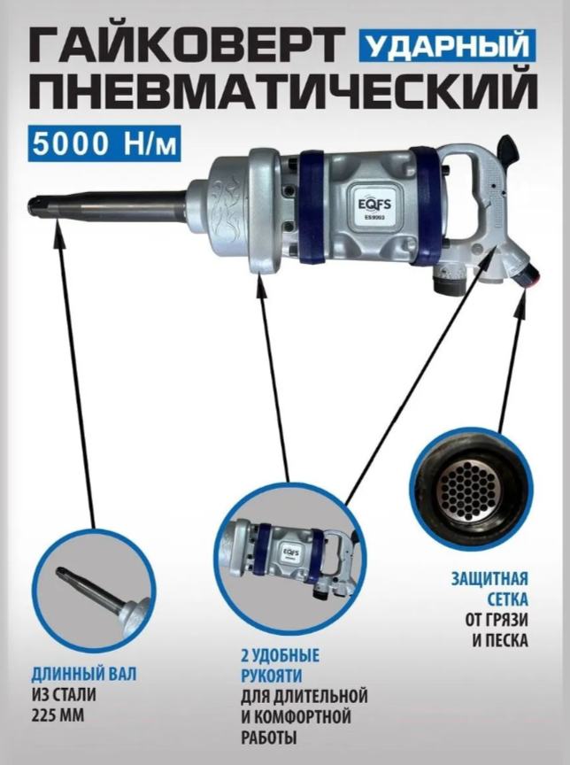 Cерия «ПРОФИ». Гайковерт 1". Ударный. Крутящий момент 5000Нм. Пневматический. Профессиональный. Длинный вал из легированной стали. Вес: 19,5 кг. Механизм гайковерта – Pinless Hammer. Корпус металлический с двумя рукоятями. Реверс, регулировка скорости, регулировка крутящего момента. Для грузовых автомобилей, автобусов, троллейбусов, спецтехники, производственных предприятий и в нефтегазовой отрасли.