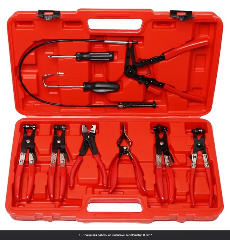 Клещи для работы со шлангами AutoMeister TES017 - помогают быстро и безопасно работать со шлангами и патрубками всевозможных систем двигателя, берегут руки оператора при демонтаже хомутов, обеспечивают простоту доступа в труднодоступные места. В наборе девять предметов для разных задач.