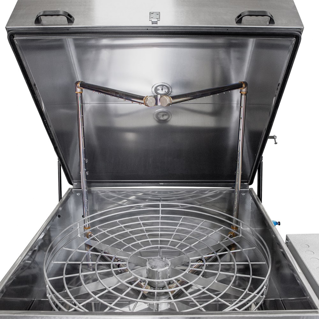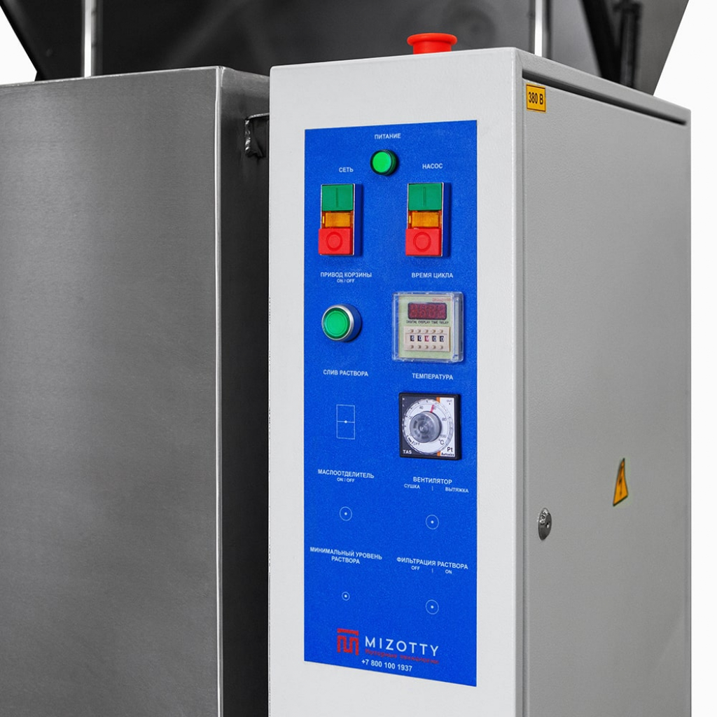 Температура и продолжительность цикла обработки задается на панели управления. Вращение корзины обеспечивает необходимое позиционирование деталей перед коллекторами. Парная П-образная форма рамп позволяет промывать изделия сверху, снизу и сбоку в течение заданного времени. Автоматические промывочные установки серии АМ предназначены для использования со слабощелочными растворами. Для наполнения бака используется обычная водопроводная вода.