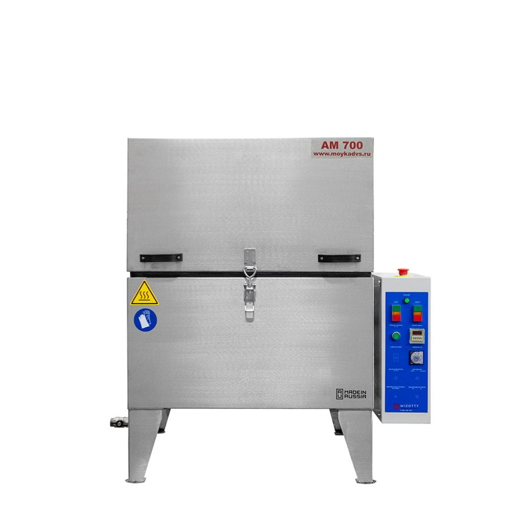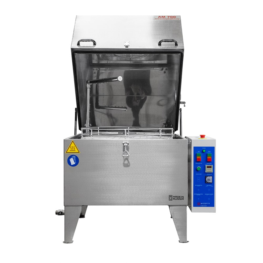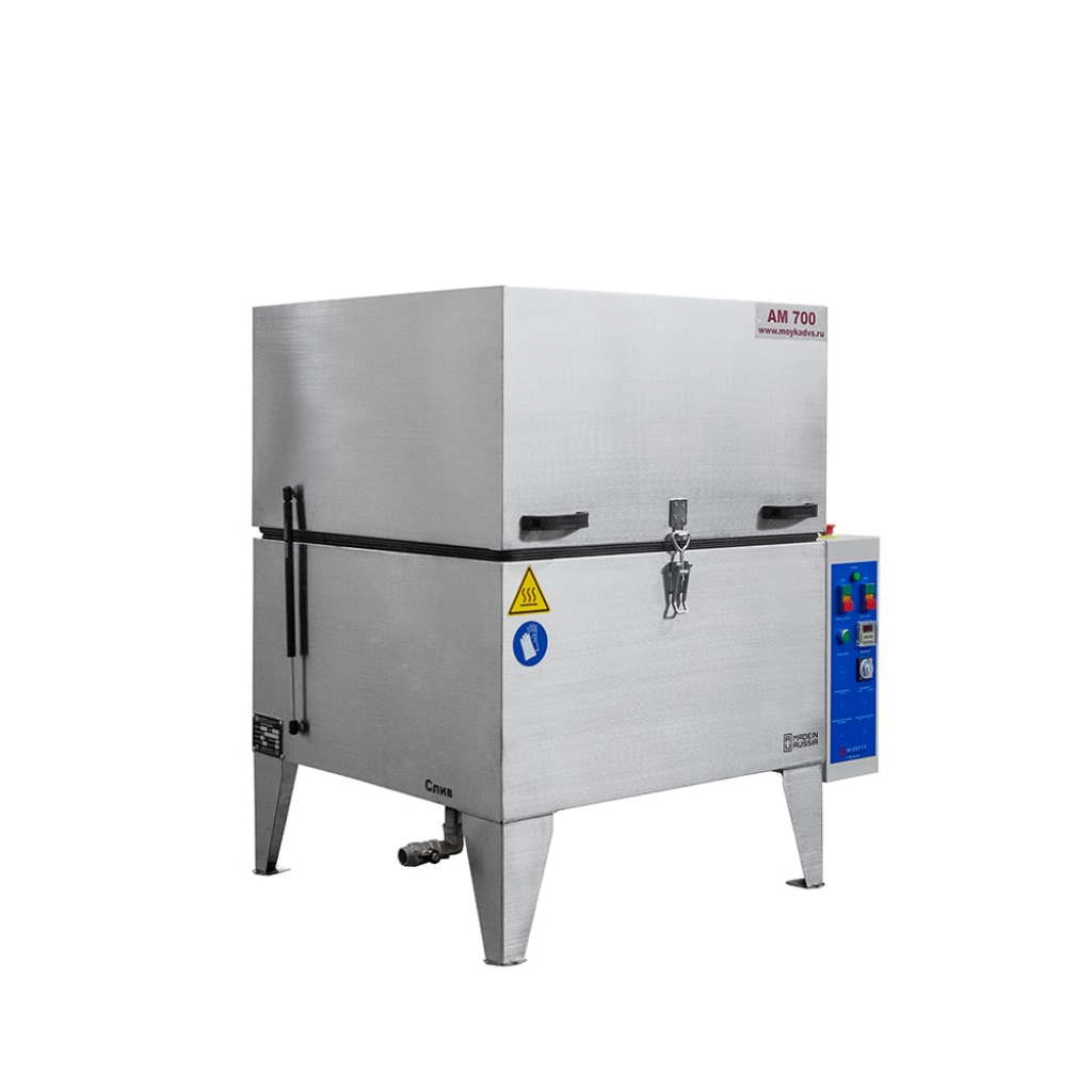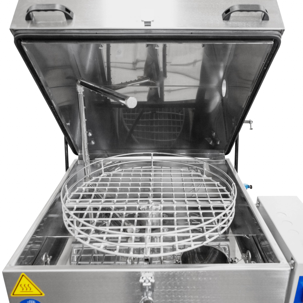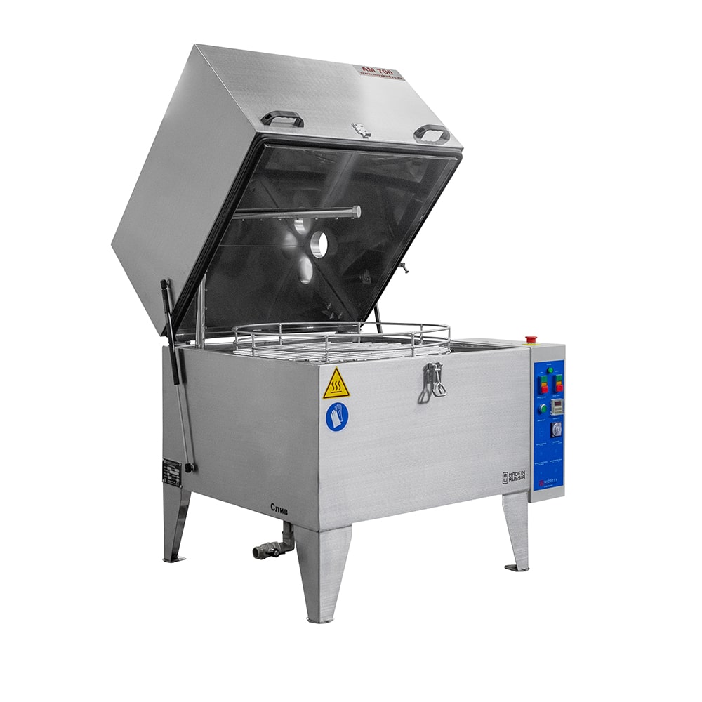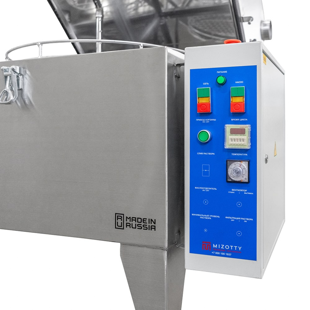 Температура и продолжительность цикла обработки задается на панели управления. Вращение корзины обеспечивает необходимое позиционирование деталей перед коллекторами. Парная П-образная форма рамп позволяет промывать изделия сверху, снизу и сбоку в течение заданного времени. Автоматические промывочные установки серии АМ предназначены для использования со слабощелочными растворами. Для наполнения бака используется обычная водопроводная вода.