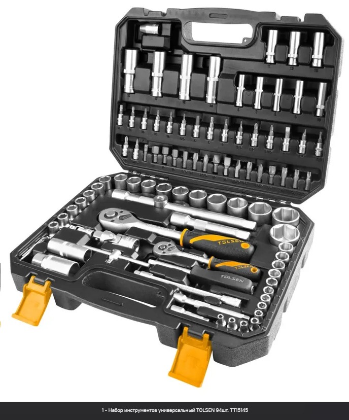 Набор инструментов универсальный TOLSEN 94шт. TT15145 - подойдёт в качестве надёжного помощника для любого автомобиля в дороге, для работы в гараже, а также в любой мастерской или станции ТО.