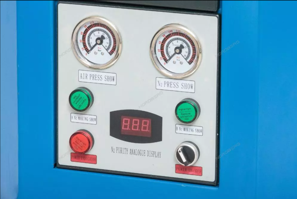 Генераторы азота NORDBERG производят азот путем разделения сжатого воздуха, поступающего через мембранные фильтры которые способны отделить молекулы кислорода от азота. На выходе генератора чистота азота 95%.