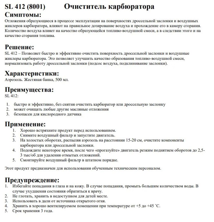 • Очищает карбюраторы, электронные и механические дроссельные заслонки.