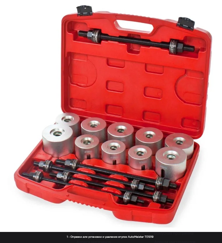 Оправки для установки и удаления втулок AutoMeister TE1019 - отлично подойдут для установки и удаления большинства автомобильных втулок. В комплекте 20 оправок из прочного металла, загруженные в качественный пластиковый кейс. Внутренний диаметр: 34, 36, 38, 40, 42, 44, 46, 48, 50, 52, 54, 56, 58, 60, 62, 64, 66, 68, 70, 72, 75 и 80мм; Внешний диаметр: 44, 46, 48, 50, 52, 54, 56, 58, 60, 62, 64, 66, 68, 70, 72, 74, 76, 78, 80, 82, 85 и 90.
