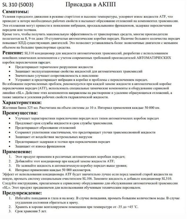• Эффект от использования кондиционера ATF будет значительно лучше, если перед заменой старой жидкости на новую промыть систему специальным очистителем SL106.