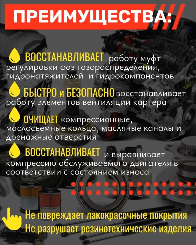 Восстанавливает работу муфт регулировки фаз газораспределения, гидронатяжителей и гидрокомпенсаторов.