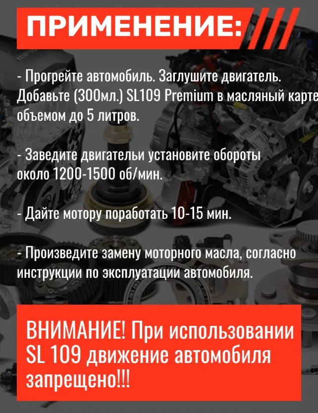 Этот продукт предназначен для использования обученным техническим персоналом. Внимание! При использовании SL 109 движение автомобиля запрещено!Рекомендуется применять в качестве профилактики при каждой замене моторного масла