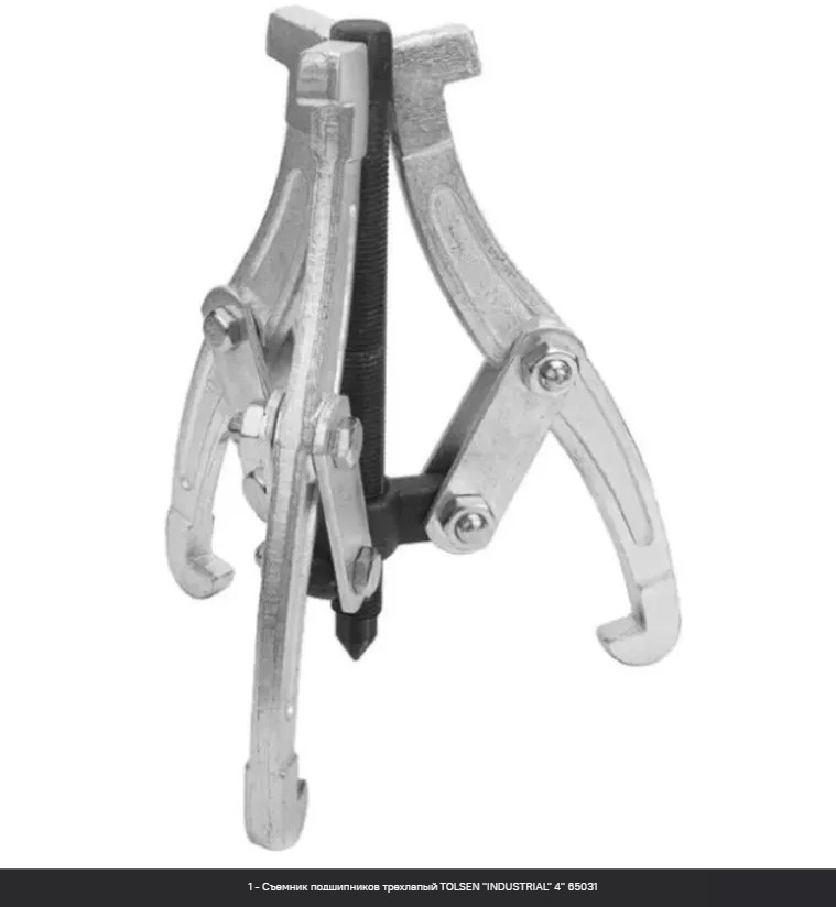 Съемник подшипников трехлапый TOLSEN "INDUSTRIAL" 4" 65031 - предназначен для снятия шестерен, подшипников, шкивов и других деталей с валов. Инструмент изготовлен из высококачественной закаленной стали, что обеспечивает долговечность и устойчивость к нагрузкам. Регулируемые зажимы обеспечивают универсальность использования на различных размерах деталей.
