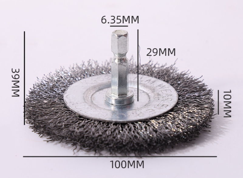 Щетка торцевая для дрели от для снятия различных покрытий с изделий и поверхностей. Изделие имеет плоскую форму, рабочая часть выполнена из высококачественной, прочной проволоки волнистой формы толщиной 0,35 мм. Хвостовик шестигранный диаметром 6,35 мм. Щетка предназначена для удаления ржавчины, покрытий из лака, краски и т.п.
