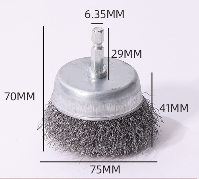 Щетка торцевая для дрели от для снятия различных покрытий с изделий и поверхностей. Изделие имеет плоскую форму, рабочая часть выполнена из высококачественной, прочной проволоки волнистой формы толщиной 0,35 мм. Хвостовик шестигранный диаметром 6,35 мм. Щетка предназначена для удаления ржавчины, покрытий из лака, краски и т.п.