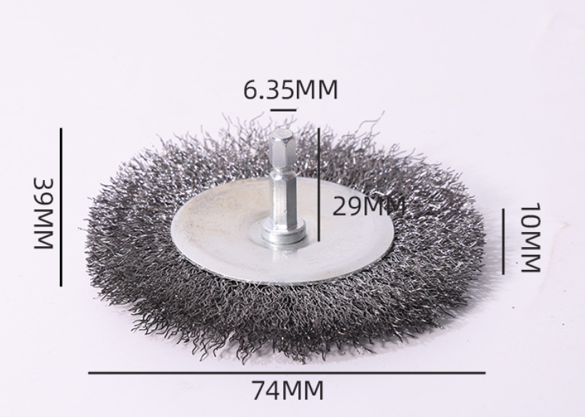 Щетка торцевая для дрели от для снятия различных покрытий с изделий и поверхностей. Изделие имеет плоскую форму, рабочая часть выполнена из высококачественной, прочной проволоки волнистой формы толщиной 0,35 мм. Хвостовик шестигранный диаметром 6,35 мм. Щетка предназначена для удаления ржавчины, покрытий из лака, краски и т.п.