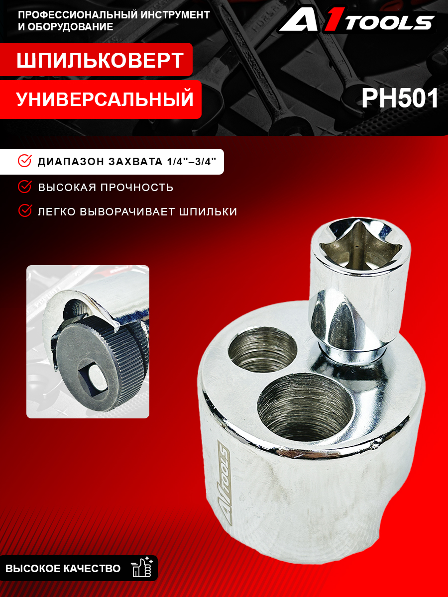 Эксцентриковый шпильковерт 1/4"-3/4" с диапазоном A1 Tools PH501 упрощает выворачивание шпилек. Для удобства конструкция оснащена пазом на посадочный квадрат 1/4"-3/4".