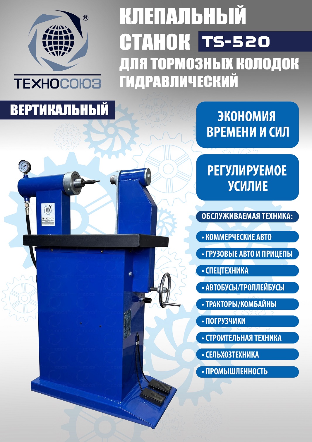 Клепальный станок управляется нажатием на педали. Выпрессовка заклепок диаметром до 12 мм осуществляется при замене изношенных накладок во время ремонта автомобилей в автосервисах, станциях технического обслуживания и автотранспортных предприятиях. Клепальный станок используется для работы с различными видами и формами заклепок изготовленных из стали, меди и алюминия. В стандартной комплектации предусмотрены пуансоны для работы с отечественными и импортными автомобилями.