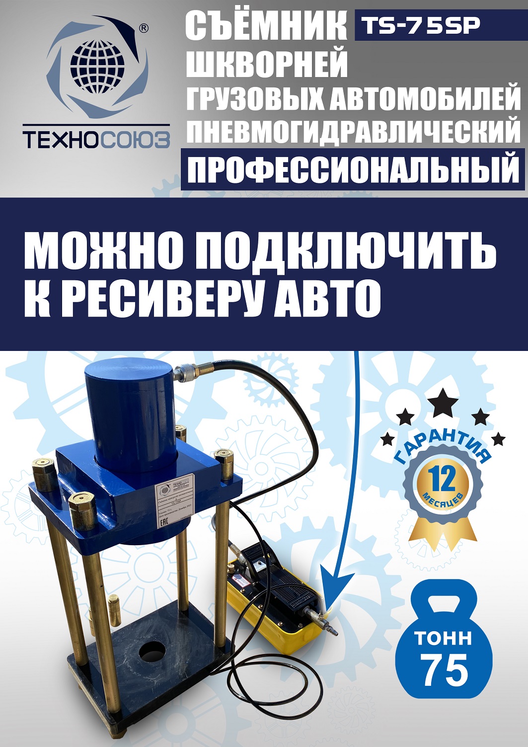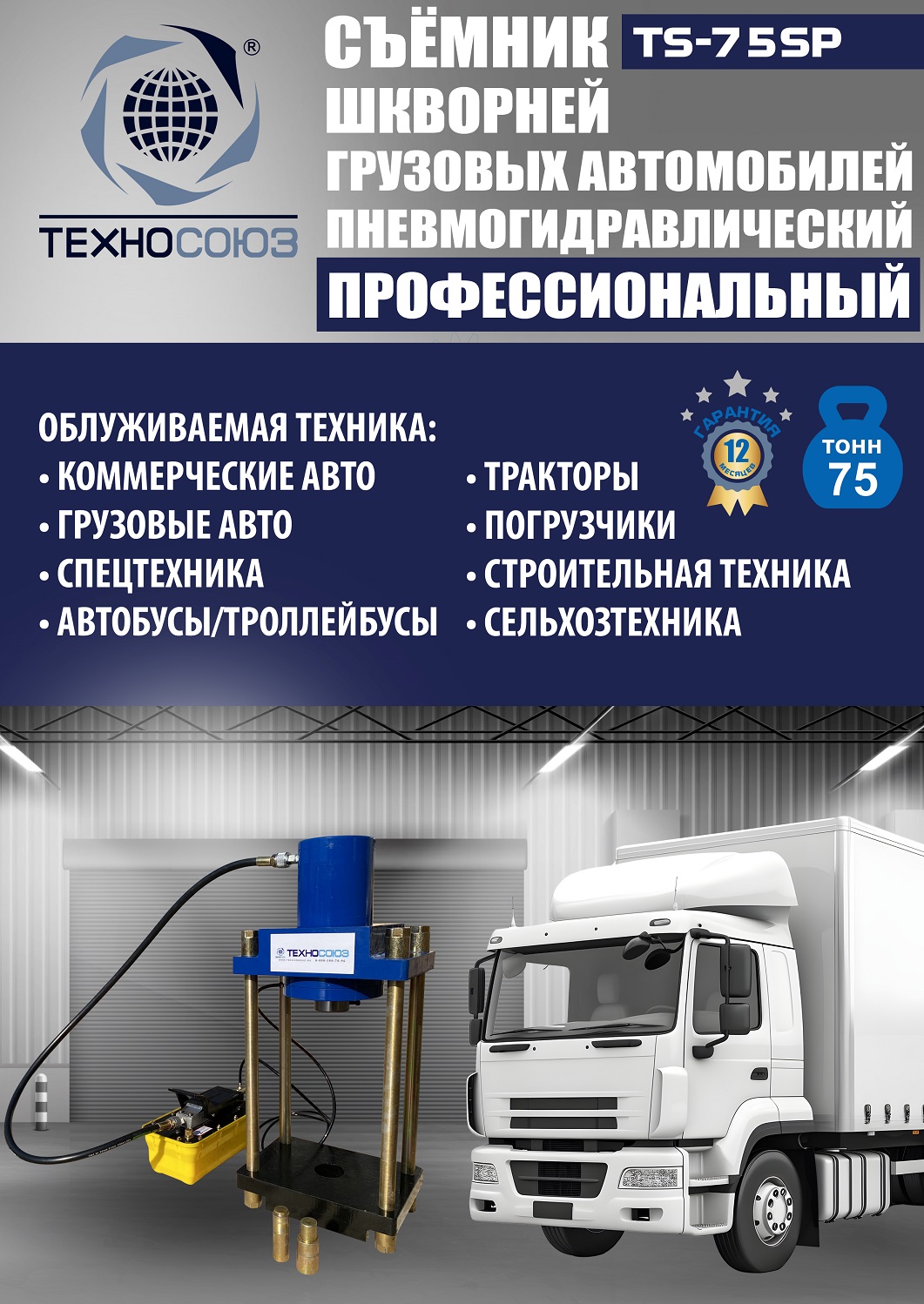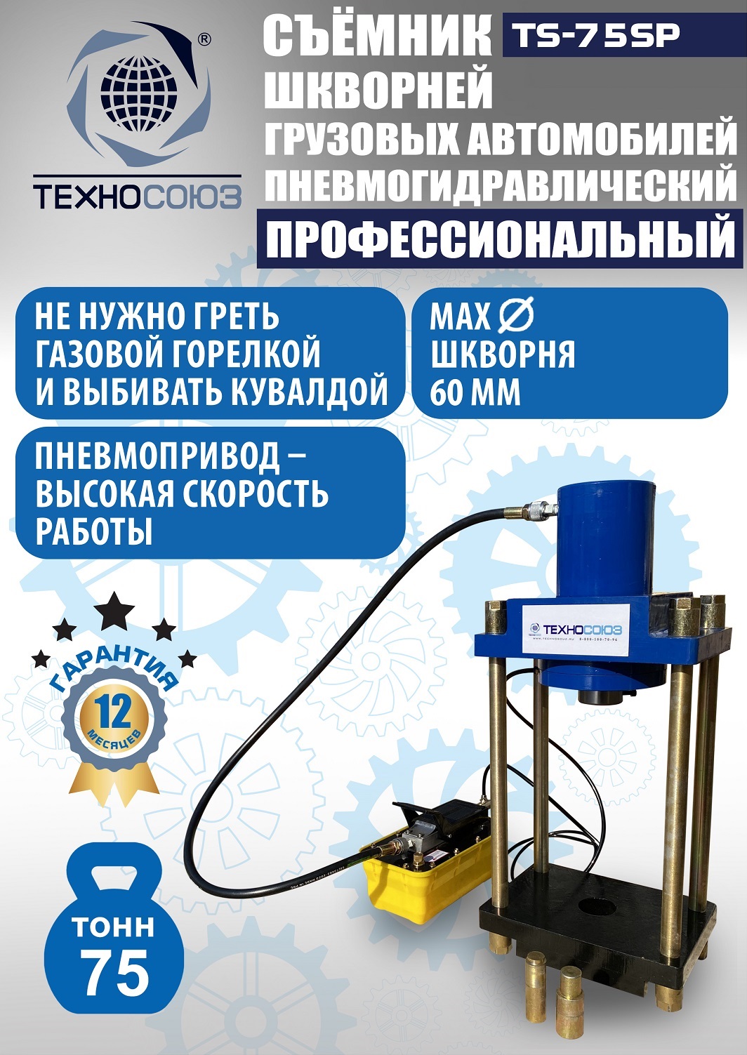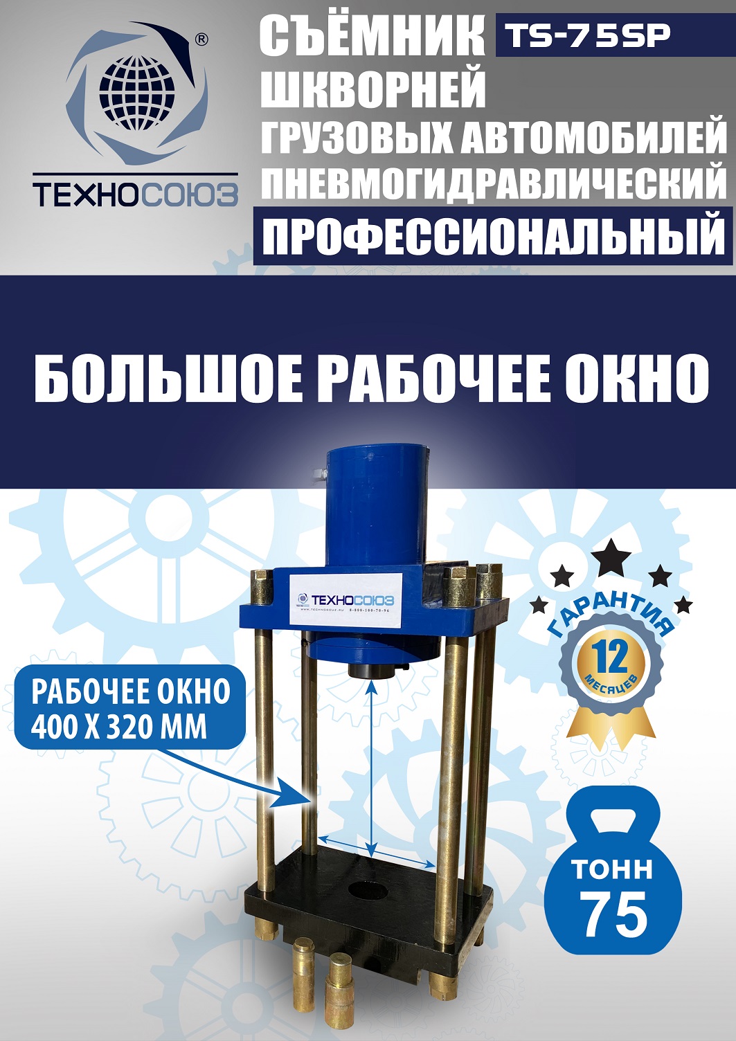 Сокращает время ремонта. Позволяет работать под разными углами. Для выпрессовки шкворней из поворотной цапфы погрузчиков, тракторов, строительной техники, коммерческих и грузовых авто отечественного и импортного производства: MAN, MERCEDES, SCANIA, VOLVO, Корейские и Китайские авто. Пневмогидравлический привод. Рабочее окно 400x320 мм. Усилие 75 тонн.