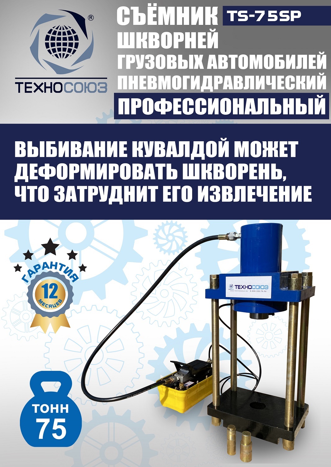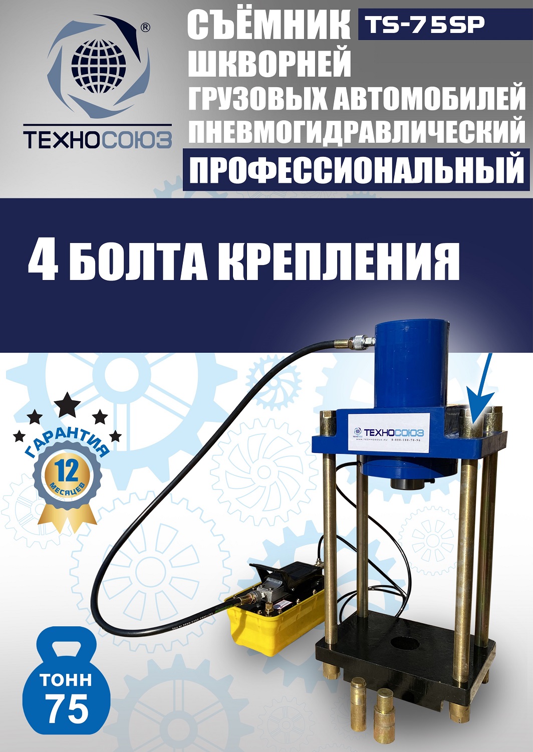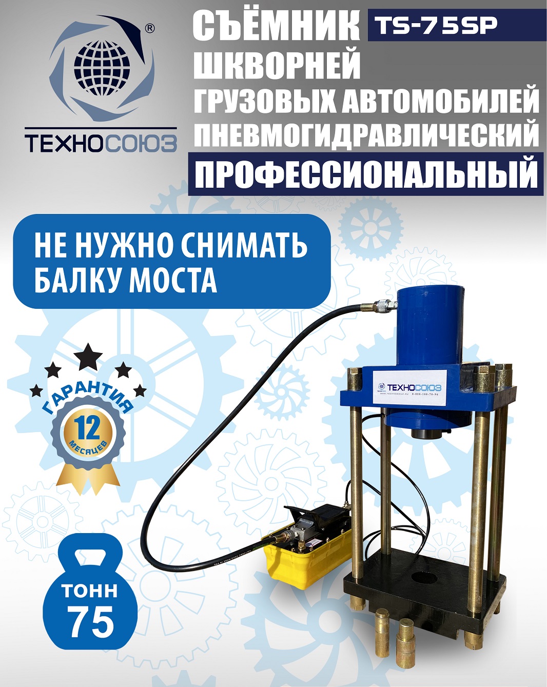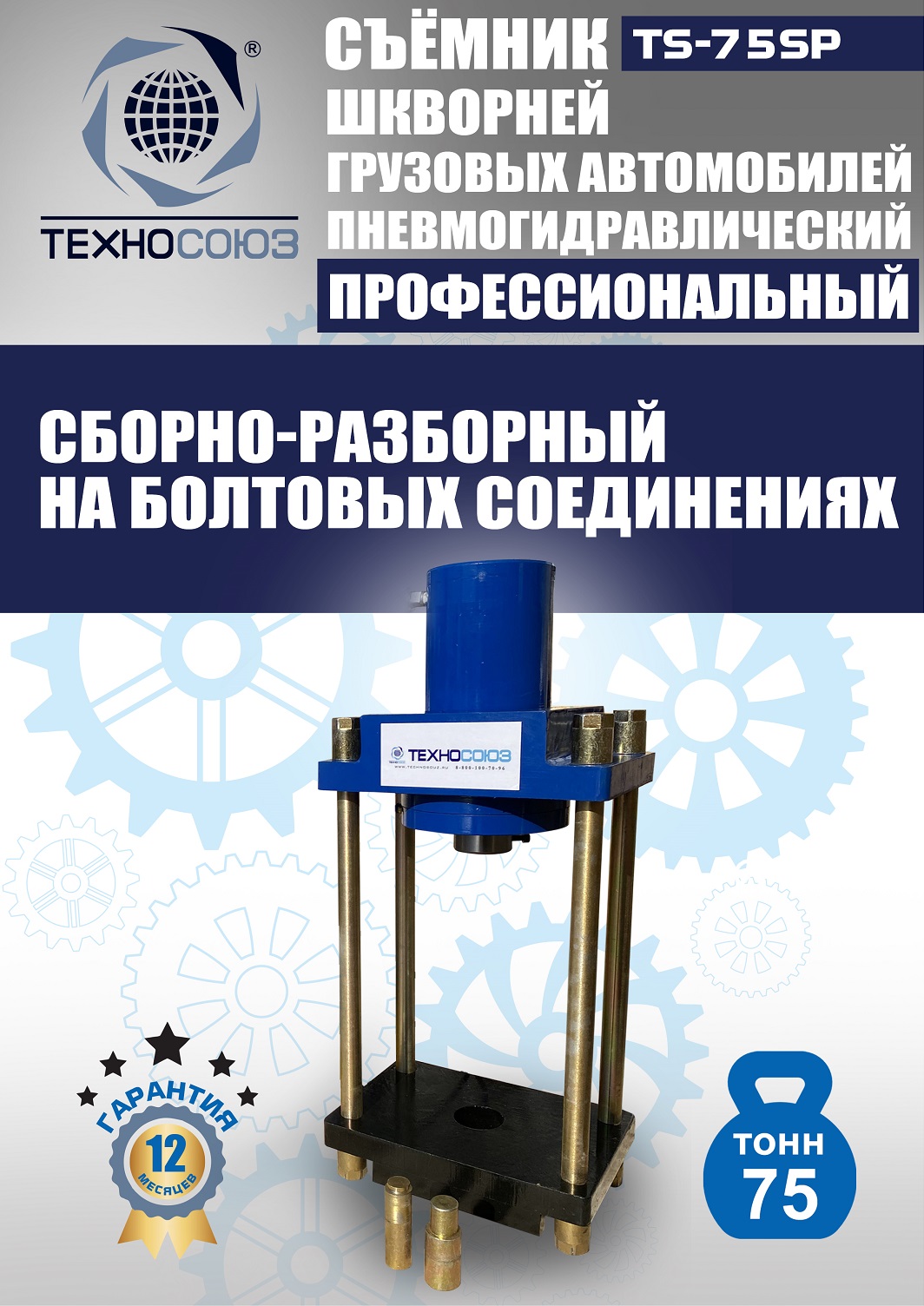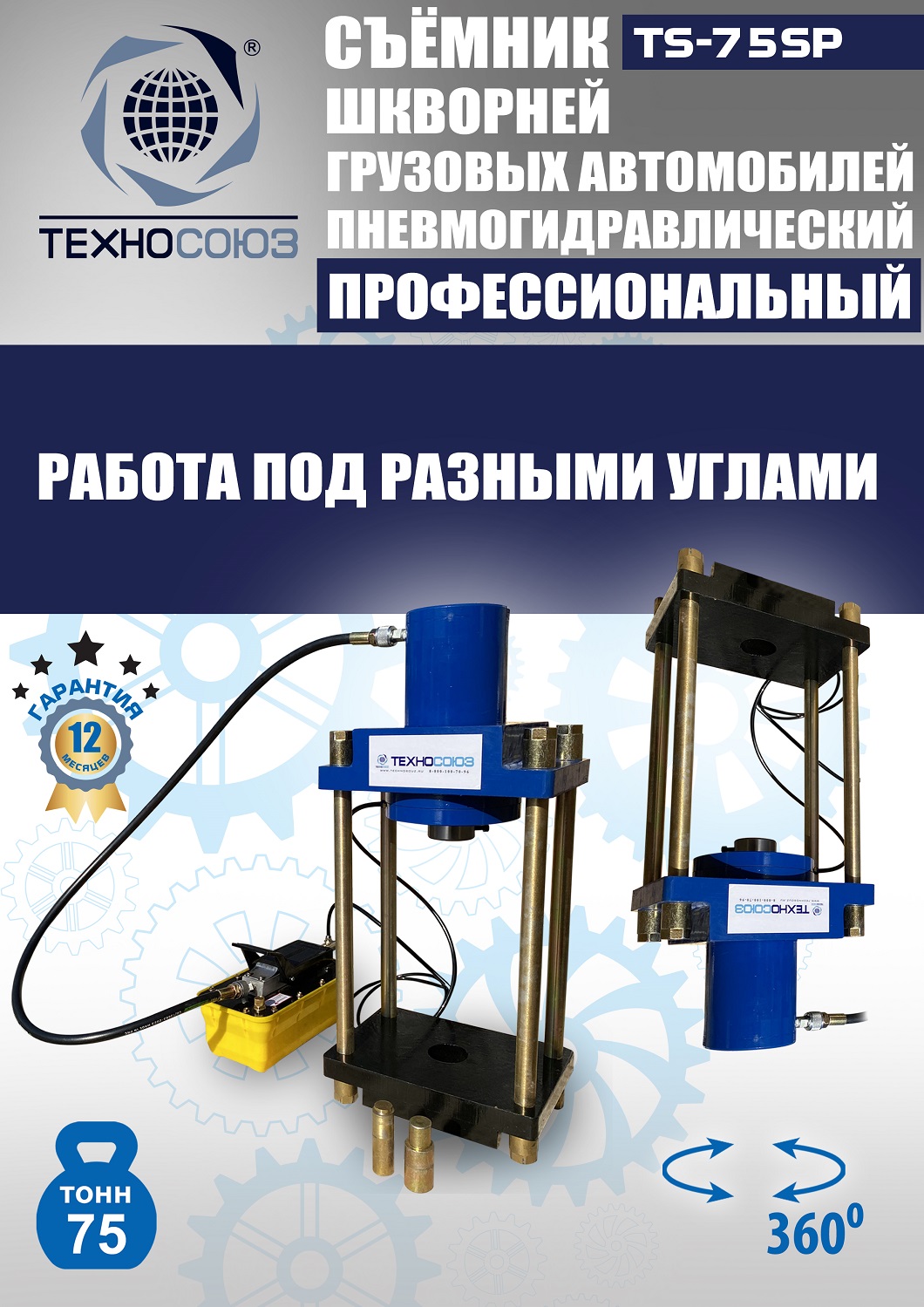 Сокращает время ремонта. Позволяет работать под разными углами. Для выпрессовки шкворней из поворотной цапфы погрузчиков, тракторов, строительной техники, коммерческих и грузовых авто отечественного и импортного производства: MAN, MERCEDES, SCANIA, VOLVO, Корейские и Китайские авто. Пневмогидравлический привод. Рабочее окно 400x320 мм. Усилие 75 тонн.
