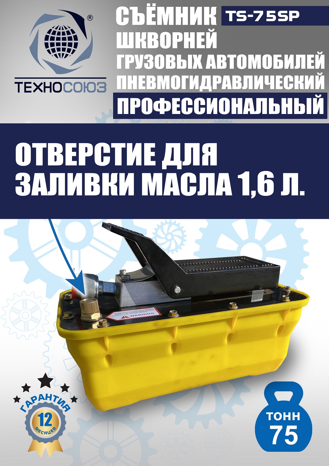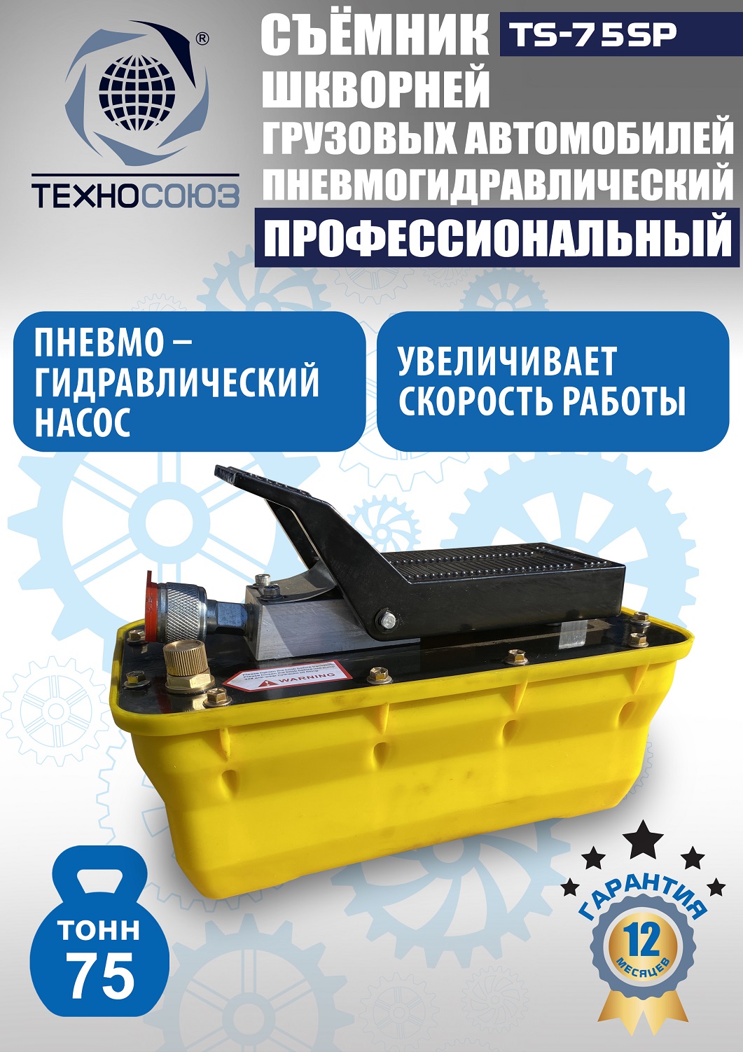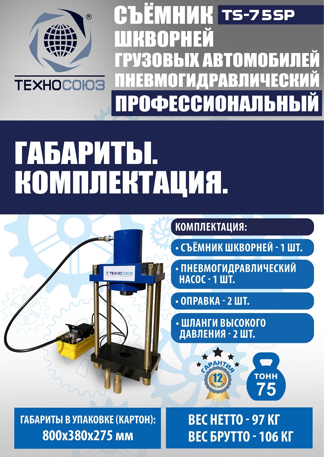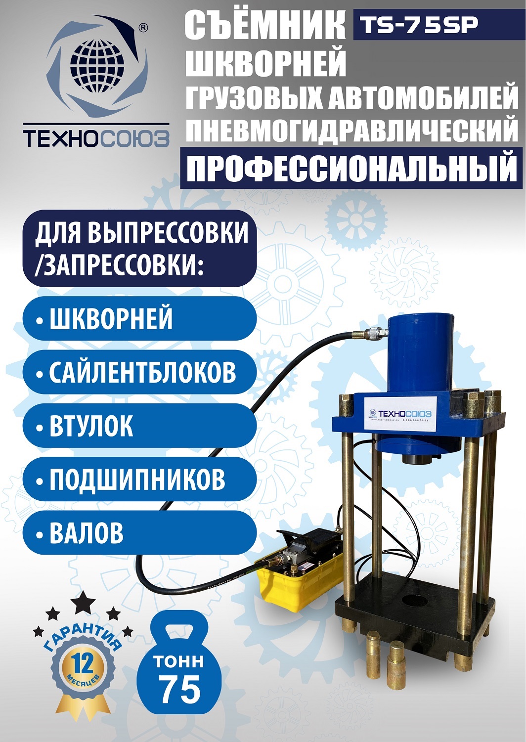 Сокращает время ремонта. Позволяет работать под разными углами. Для выпрессовки шкворней из поворотной цапфы погрузчиков, тракторов, строительной техники, коммерческих и грузовых авто отечественного и импортного производства: MAN, MERCEDES, SCANIA, VOLVO, Корейские и Китайские авто. Пневмогидравлический привод. Рабочее окно 400x320 мм. Усилие 75 тонн.