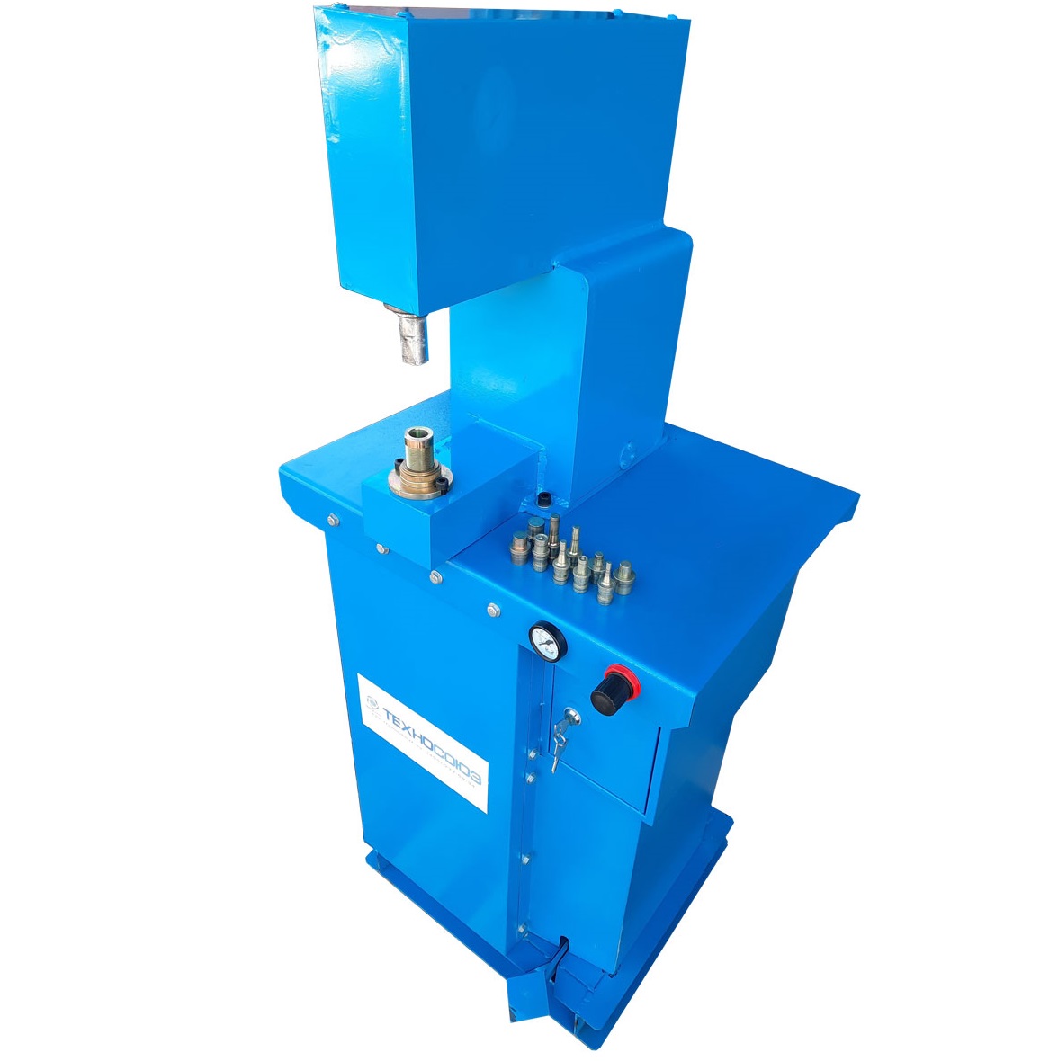 В шток вкручивается пуансон требуемого диаметра, регулируется по высоте опускание контргайкой;
