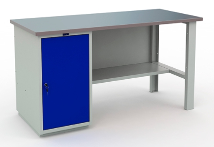 Верстак окрашен порошковой краской, цвет покрытия корпуса серый шагрень (RAL 7038), лицевая панель дверцы тумбы – синий шагрень (RAL 5002)