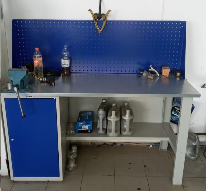 Верстак состоит из тумбы WD1 и опоры F1 .Тумба укомплектована 2-мя съемными регулируемыми полками и 1 дверцей, возможность смены стороны открывания двери. Ключевой замок на дверце тумбы. Нагрузка на полку 30 кг.